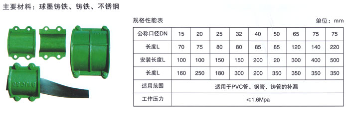 球铁补漏卡子主要用于管道裂缝和管子出现漏洞时, 理想的新型产品,密封料和金属硫化于一体,只将两件工件往管道一扣,拧紧螺栓即可。