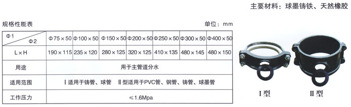 分水卡子用于主管道嫁接分支管道。主要材料:球墨铸铁, 橡胶。适用管道:国标球墨管,铸铁管,国标PVC管,PE管。工作压力:≤1.6MPa。
